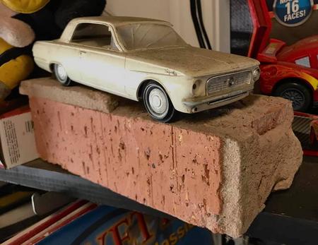 This is the '63 Valiant toy that we got from the dealer when we bought the car for Mom. It is sitting on top of a brick from the old Primary school where she picked me up in the afternoons.