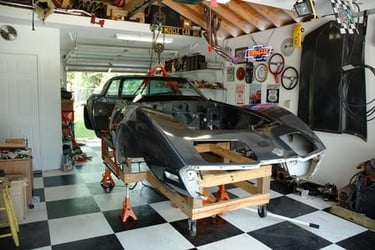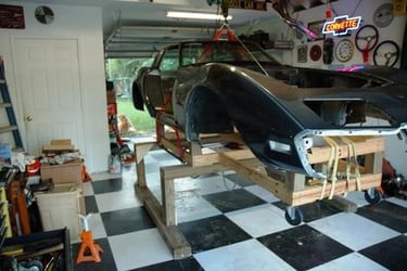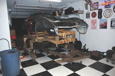 One of the big problems of doing a frame off resto build is the space required. I had built my garage specifically for doing work such as this so space had not been a problem.... until recently. My kids grew up and now have cars of their own. I do not leave cars outside at night since we live so close to two major cities. Vandalism and theft are common here. We now have 7 cars to park in the garage each night. This has caused me to put off doing work to the Vette frame lately. In looking for a solution, I came up with the idea of raising the Vette along with the body dolly so I can store the frame underneath. I designed it big enough so that a full rolling frame complete with tires to be stored under the Vette.
