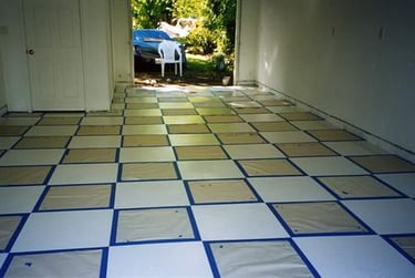 After painting the floor with White Epoxy, I started taping 2 X 2 foot squares for the Black paint.